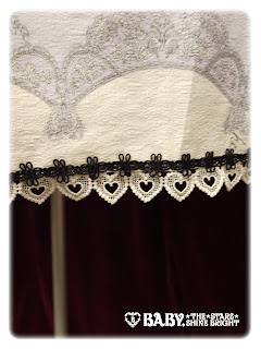 This is the Bustier dress. The bodice is well fitted, as you would expect from a bustier style top. The bodice is also a pretty shape. The waist bow is a bit soft and droopy, but it looks better this way. If this bow was stiffer, I don't think it would have suited the dress as well. The bodice has a ribbon corset on the front. The satin ribbon is a bit on the shiny side but I don't think the shininess looks too bad. The ribbon is well spaced out and is tied off nicely at the top. Both edges of the ribbon corset are lined with lace, which is good for disguising the edges. It gives it a neater finish. The lace on the neckline looks very pretty. The gathering gives it a lovely frothy appearance and I like how it gives the illusion of a slight heart shaped neckline. The back has a small panel of shirring which is concealed by a ribbon corset. The ribbon does look a bit bunched together here, but it does keep the shirring hidden. My only complaint would be that I wish the sizing was a bit more flexible so a wider range of sizes could wear it. The skirt has a very pretty rounded shape to it. It flares out really well, which I think it works great when paired with the tighter bodice. The overall shape definitely reminds me of a ballerina's dress. The print is displayed well because the skirt is kept clutter free. The bottom hem is finished off with some gorgeous crown lace, which I absolutely love.