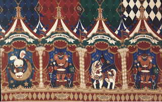 Finally, here we have the print. As we can see, this series comes in blue, wine, green and black. These are pretty standard colour choices for whenever AP does a circus themed print and once again they all work very well. The dark colours compliment the gold accents in the print. As for the print, it is well executed but I am getting a strong sense of deja vu looking at it. If it wasn't for the harlequin colomns in between the toys, I would have easily mistaken this for AP's Toy March print. In fact, the toys in this new print are almost identical (there is no squirrel this time though). It is still a very well drawn print though. I really like the bunny riding the moon. That is my favourite part. The biggest variation with this print is the inclusion of the circus tent tops, which serves as a great way to break up the border from the non-border part of the print, and the diamond background. I really like these details, especially the diamonds, so I am inclined to like this print a bit more than Toy March. It is still disappointing when AP keep churning out similar looking prints though.